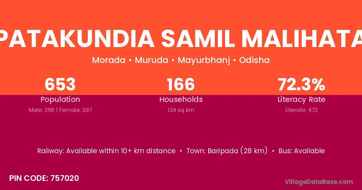 Baripada (28 km) is the nearest town to Patakundia Samil Malihata village for major economic activities and is located approximately 28 km away.