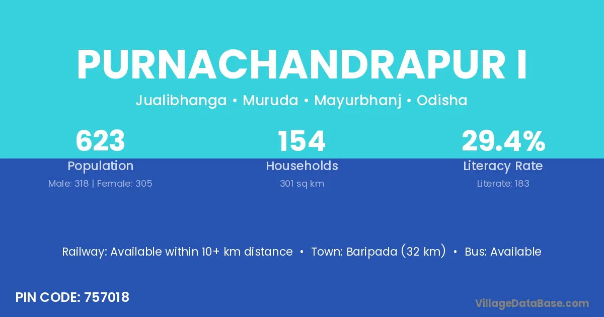 Baripada (32 km) is the nearest town to Purnachandrapur I village for major economic activities and is located approximately 32 km away.