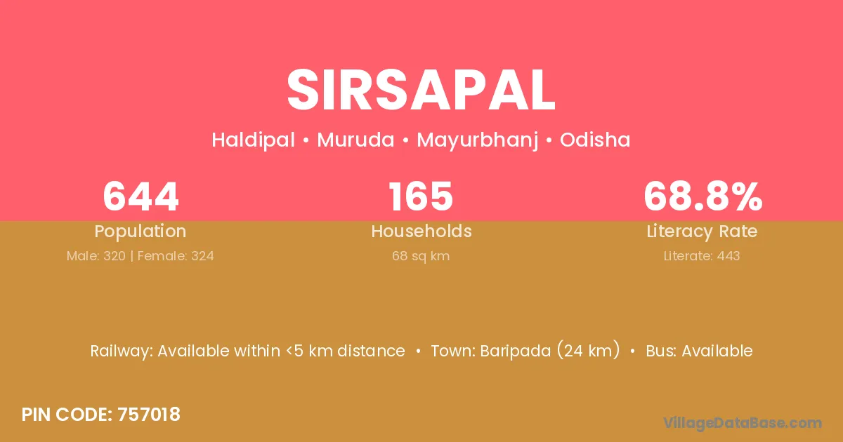 Baripada (24 km) is the nearest town to Sirsapal village for major economic activities and is located approximately 24 km away.