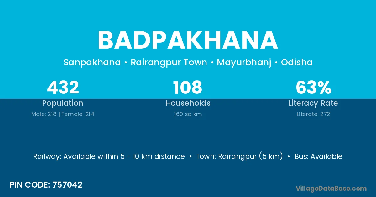 Rairangpur (5 km) is the nearest town to Badpakhana village for major economic activities and is located approximately 5 km away.