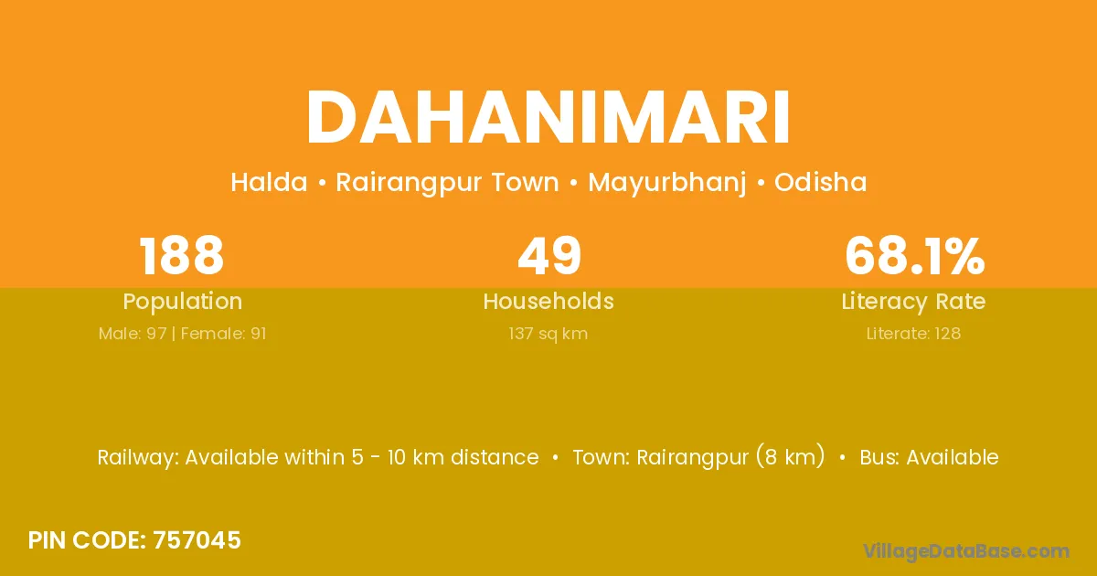Rairangpur (8 km) is the nearest town to Dahanimari village for major economic activities and is located approximately 8 km away.
