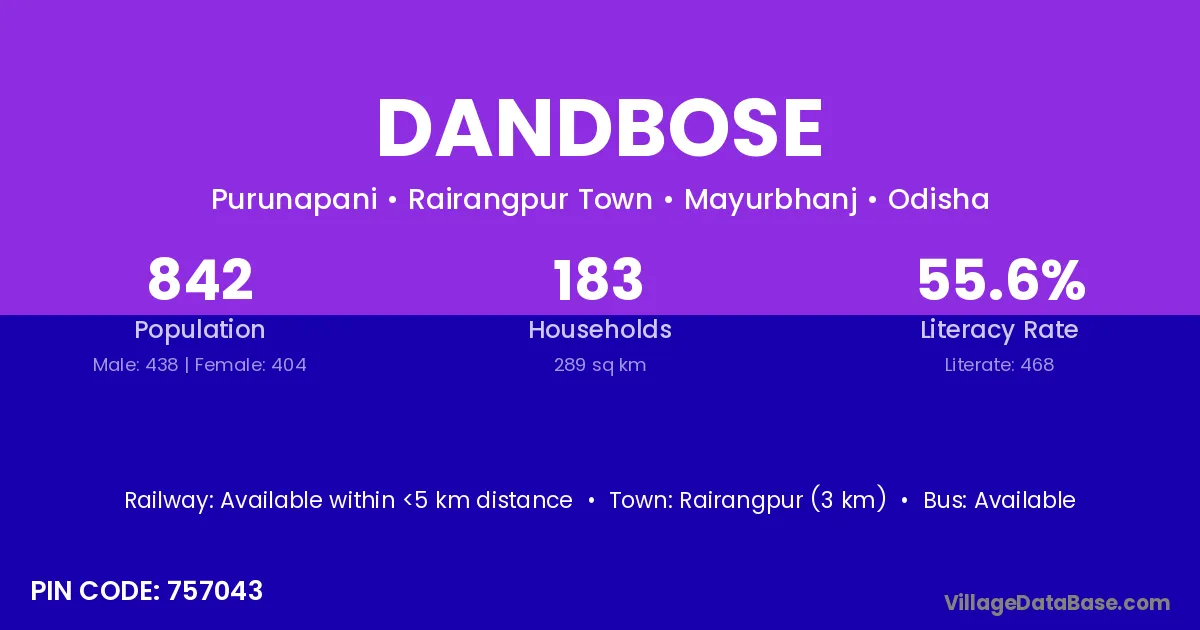Rairangpur (3 km) is the nearest town to Dandbose village for major economic activities and is located approximately 3 km away.
