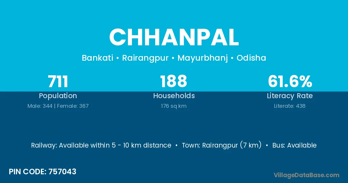 Rairangpur (7 km) is the nearest town to Chhanpal village for major economic activities and is located approximately 7 km away.