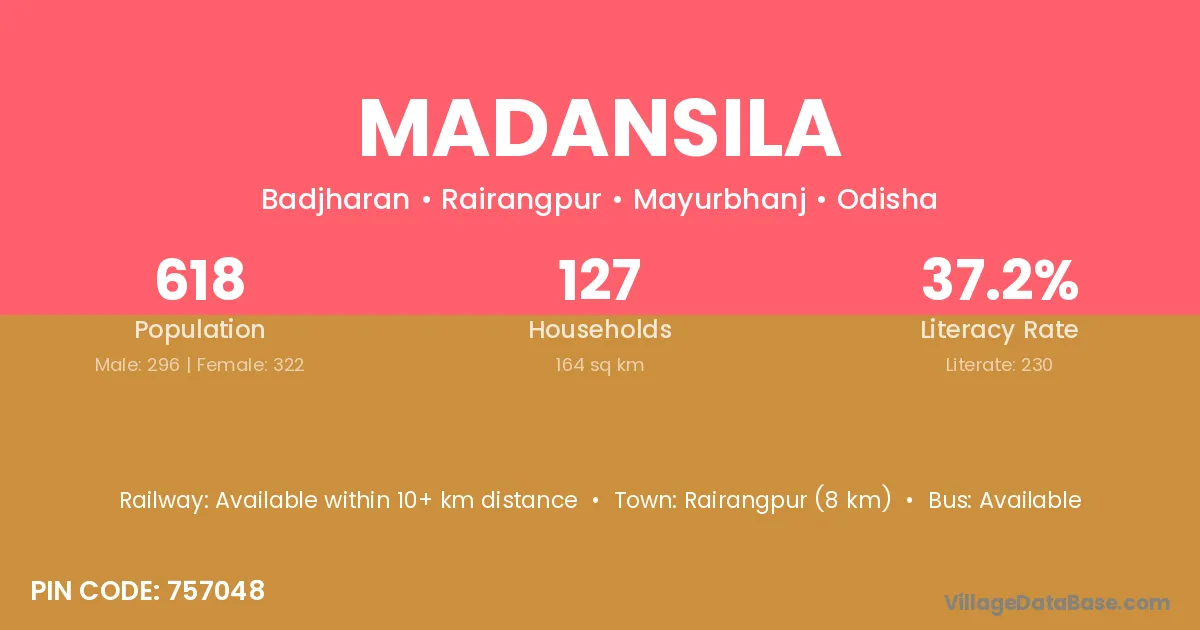 Rairangpur (8 km) is the nearest town to Madansila village for major economic activities and is located approximately 8 km away.