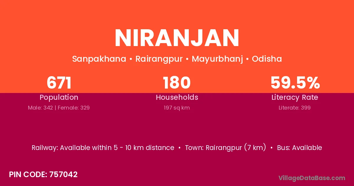 Rairangpur (7 km) is the nearest town to Niranjan village for major economic activities and is located approximately 7 km away.