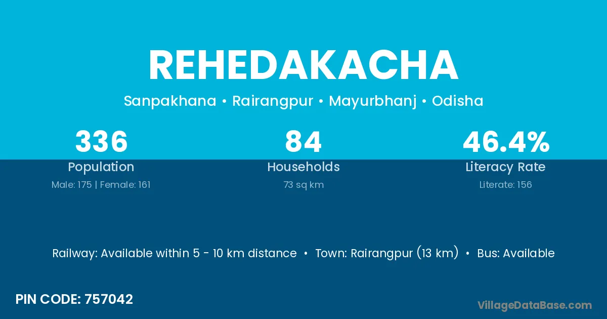 Rairangpur (13 km) is the nearest town to Rehedakacha village for major economic activities and is located approximately 13 km away.