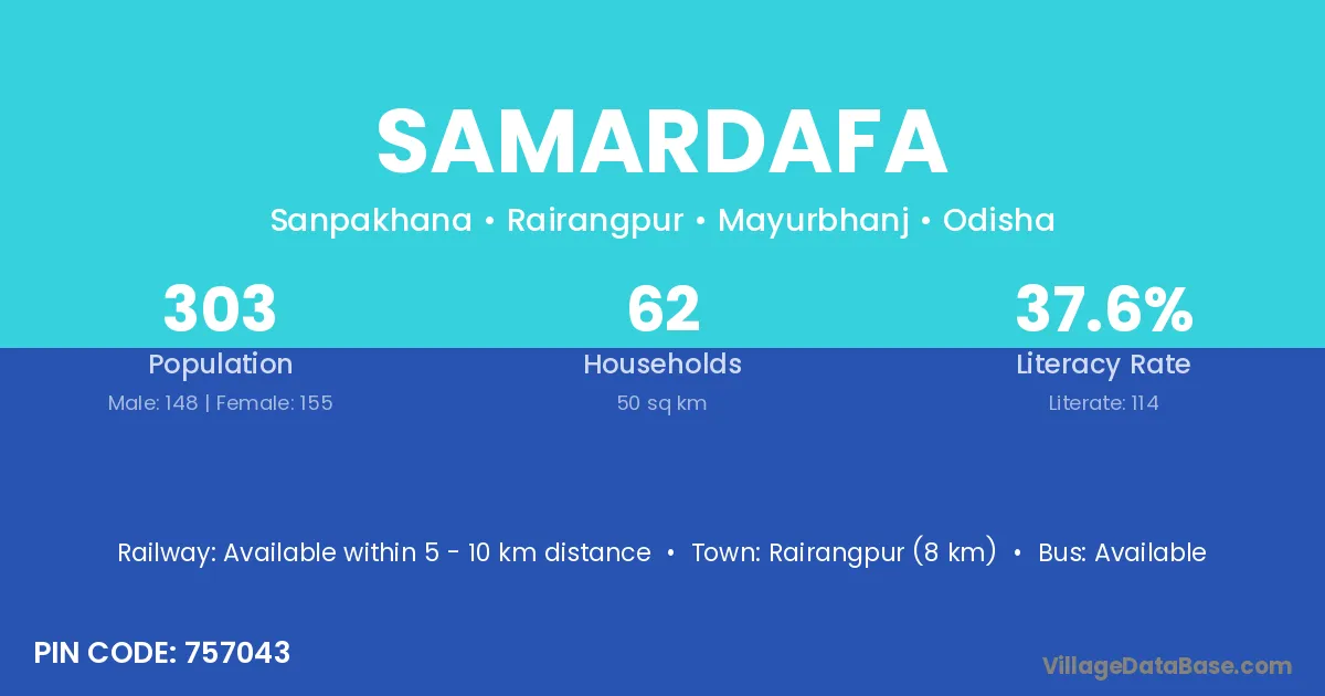 Rairangpur (8 km) is the nearest town to Samardafa village for major economic activities and is located approximately 8 km away.