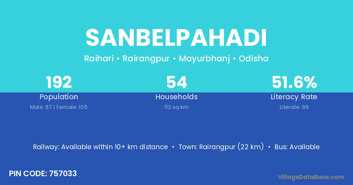 Rairangpur (22 km) is the nearest town to Sanbelpahadi village for major economic activities and is located approximately 22 km away.