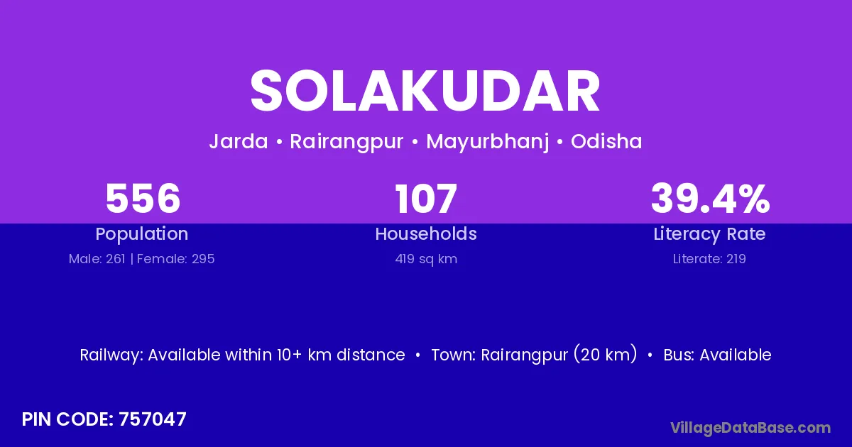 Rairangpur (20 km) is the nearest town to Solakudar village for major economic activities and is located approximately 20 km away.