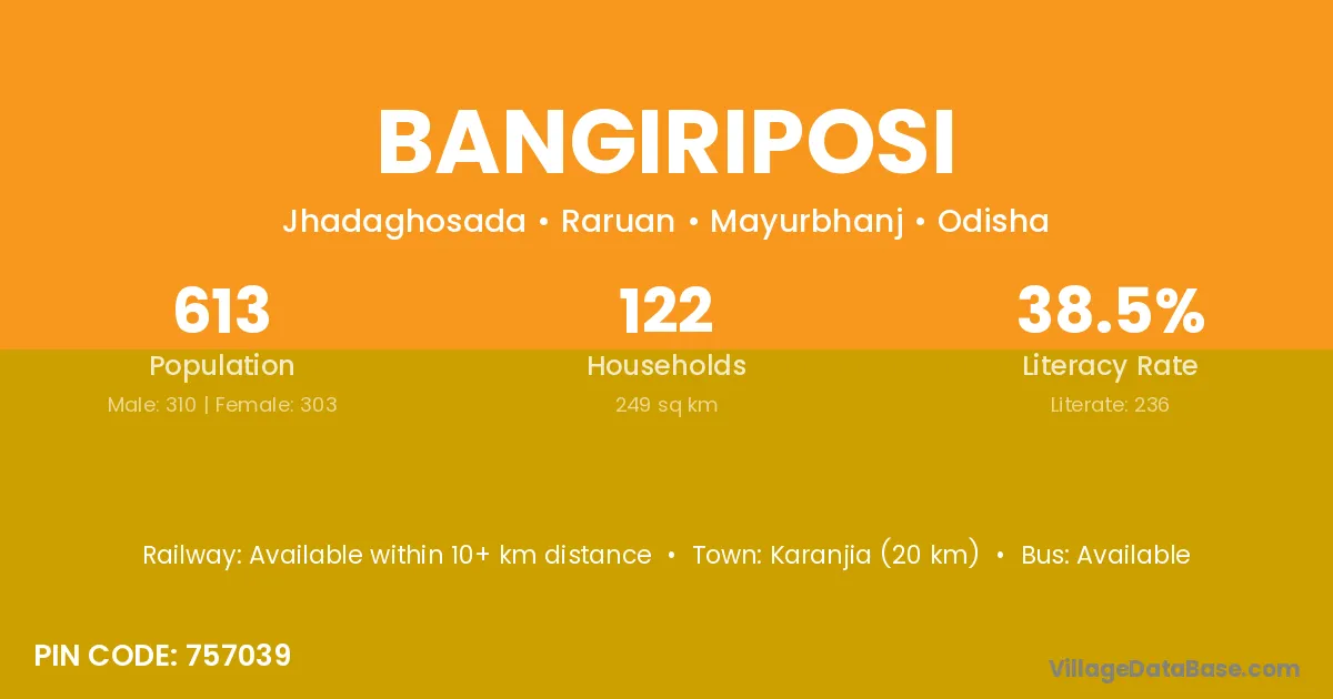Bangiriposi village has a total population of 613 people, of which 310 are males and 303 are females.