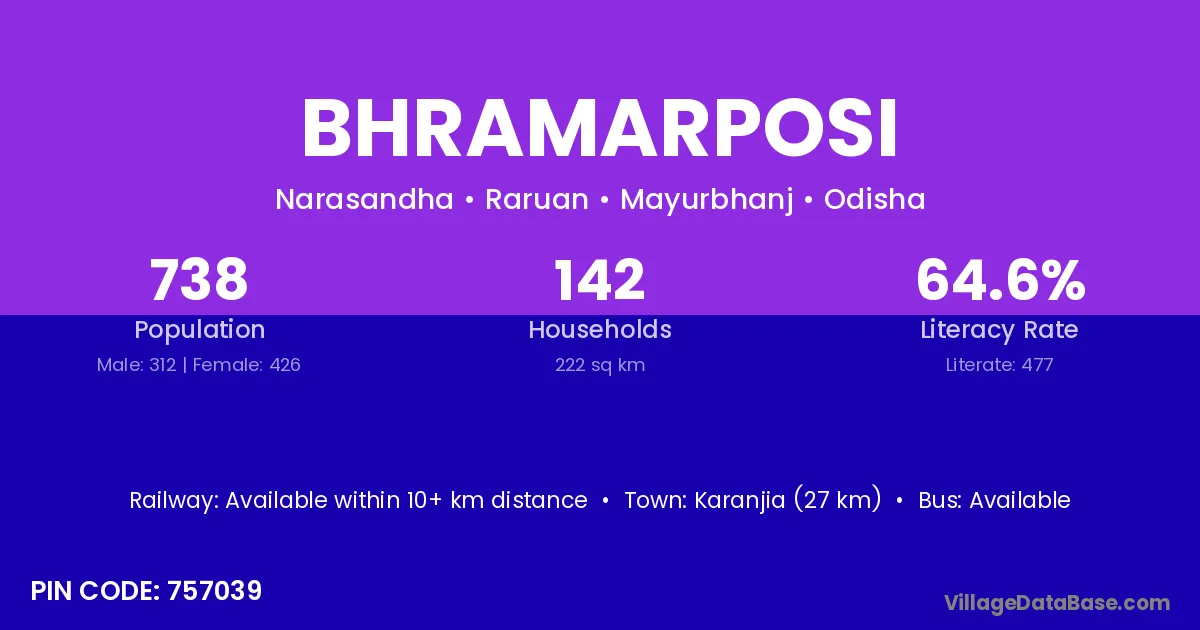Karanjia (27 km) is the nearest town to Bhramarposi village for major economic activities and is located approximately 27 km away.