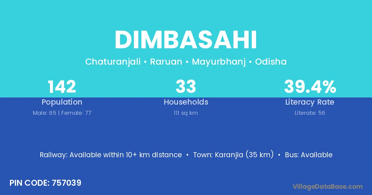 Karanjia (35 km) is the nearest town to Dimbasahi village for major economic activities and is located approximately 35 km away.