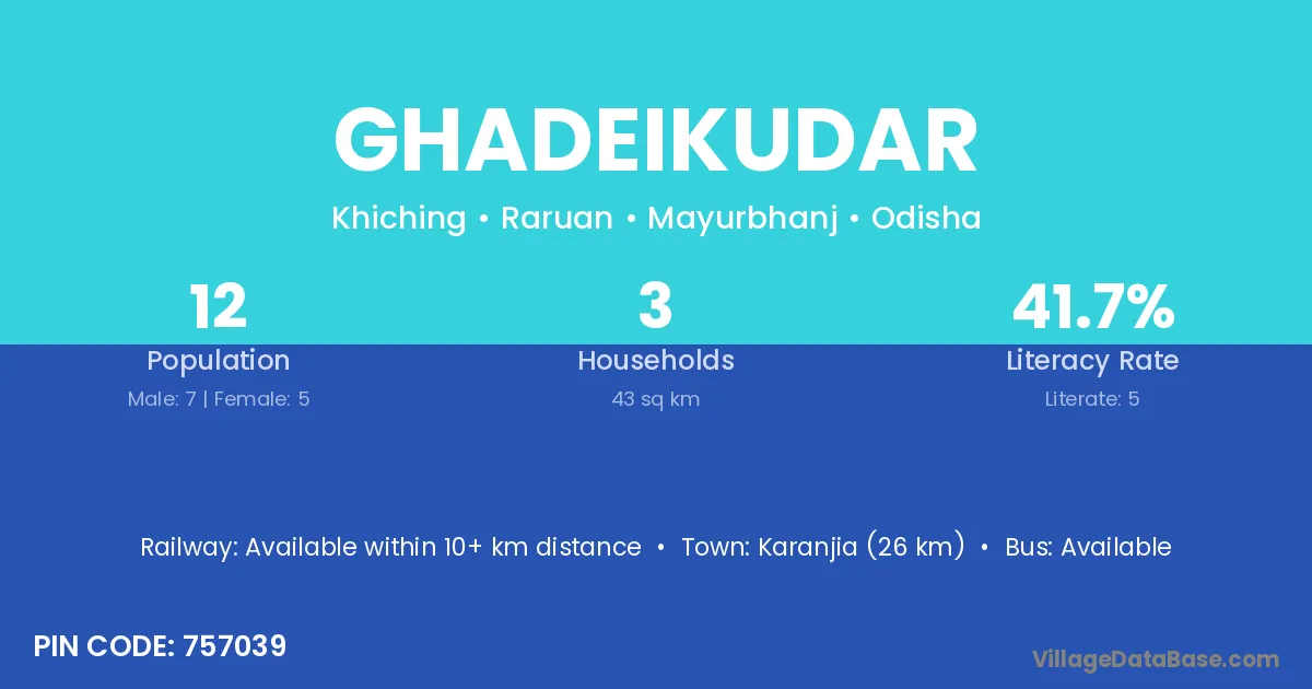 Karanjia (26 km) is the nearest town to Ghadeikudar village for major economic activities and is located approximately 26 km away.
