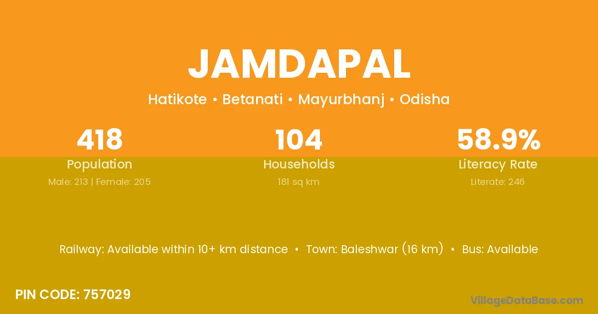 Karanjia (22 km) is the nearest town to Jamdapal village for major economic activities and is located approximately 22 km away.