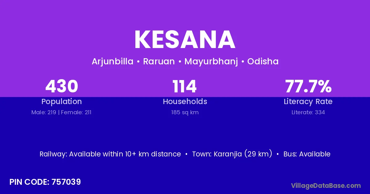 Karanjia (29 km) is the nearest town to Kesana village for major economic activities and is located approximately 29 km away.