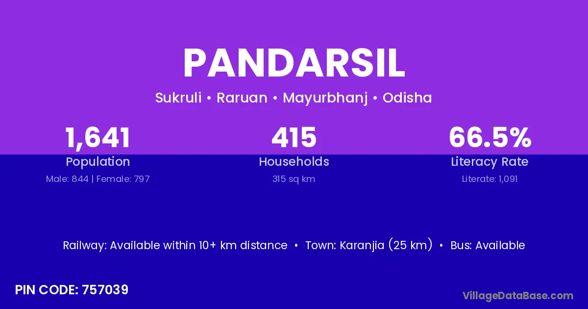 Karanjia (25 km) is the nearest town to Pandarsil village for major economic activities and is located approximately 25 km away.
