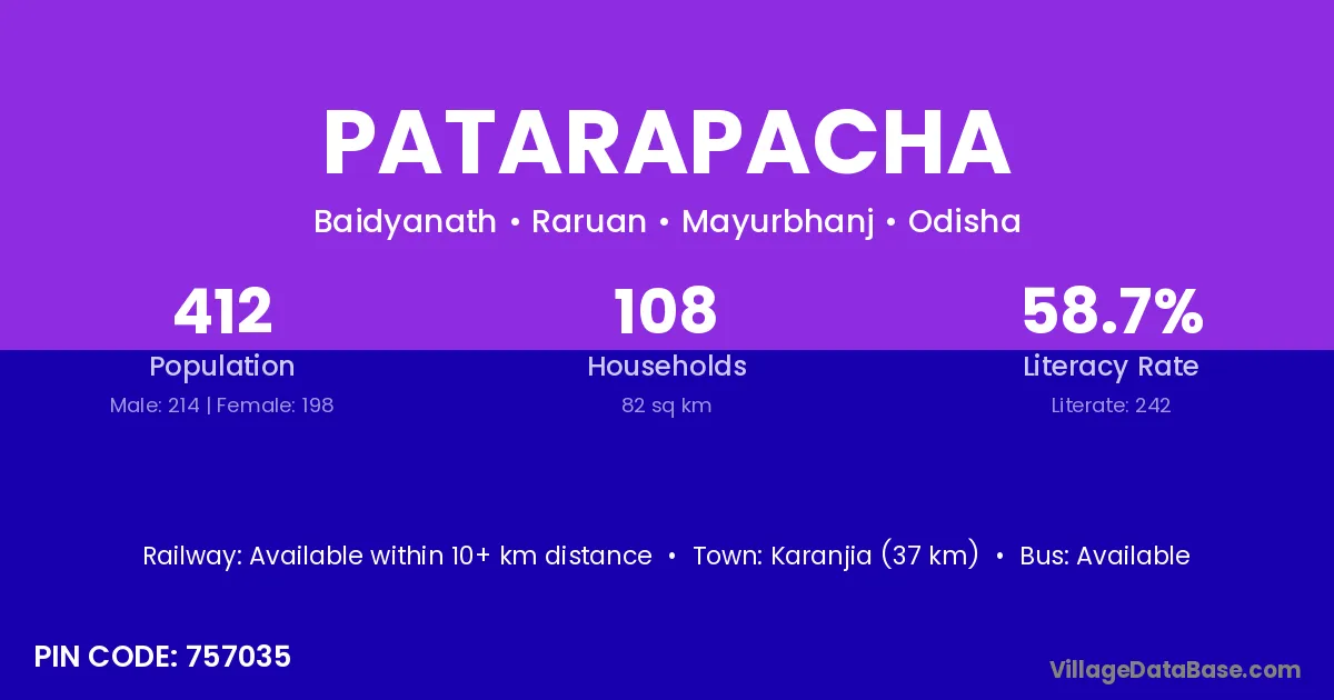Karanjia (37 km) is the nearest town to Patarapacha village for major economic activities and is located approximately 37 km away.