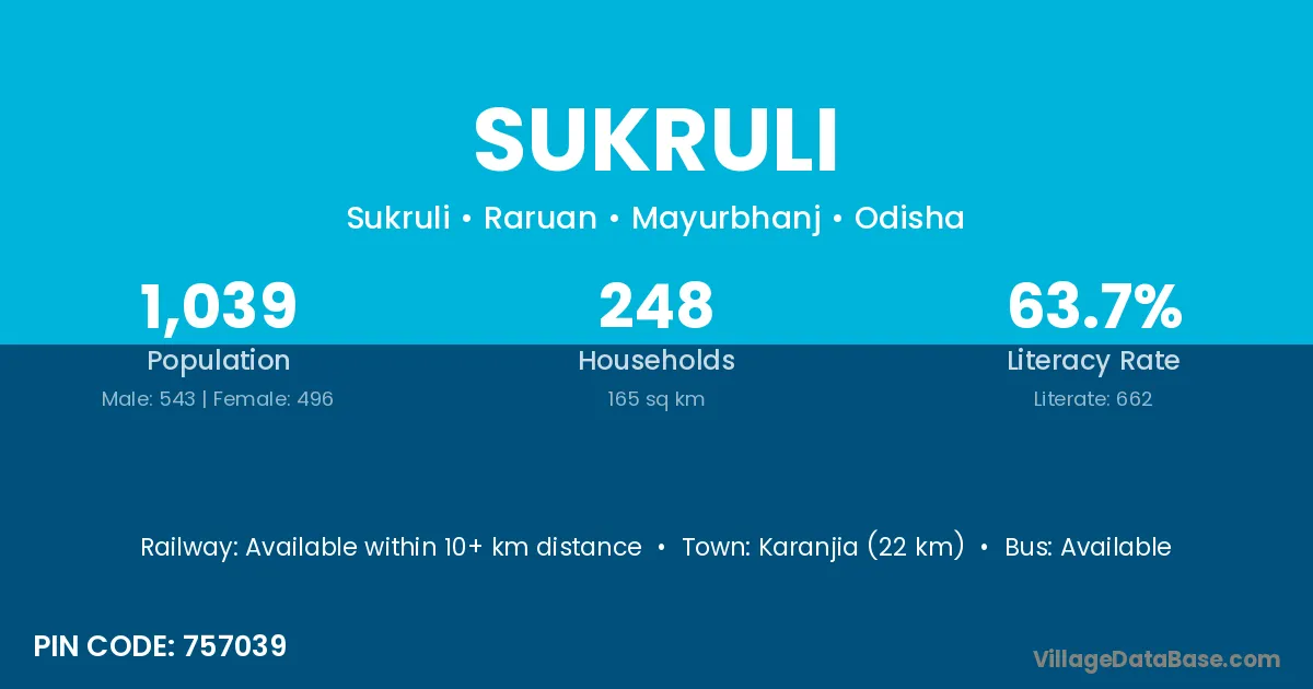 Karanjia (22 km) is the nearest town to Sukruli village for major economic activities and is located approximately 22 km away.