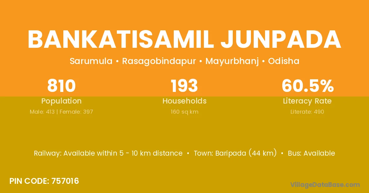 Baripada (44 km) is the nearest town to Bankatisamil Junpada village for major economic activities and is located approximately 44 km away.