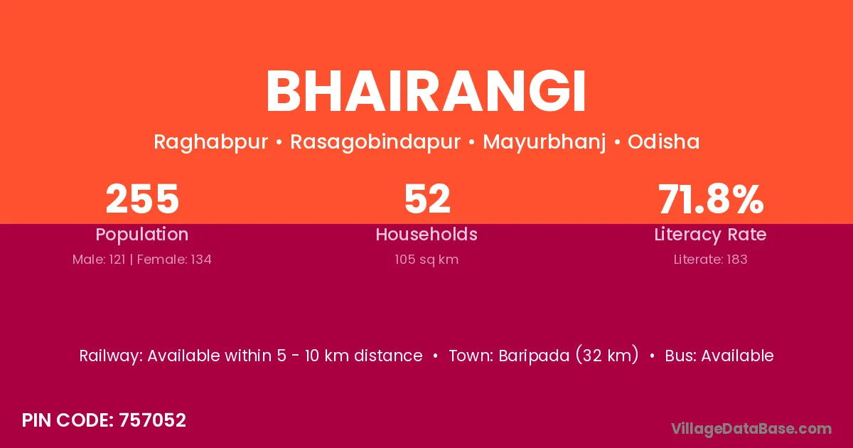 Baripada (32 km) is the nearest town to Bhairangi village for major economic activities and is located approximately 32 km away.