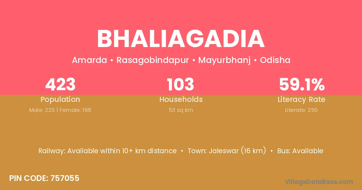 Jaleswar (16 km) is the nearest town to Bhaliagadia village for major economic activities and is located approximately 16 km away.