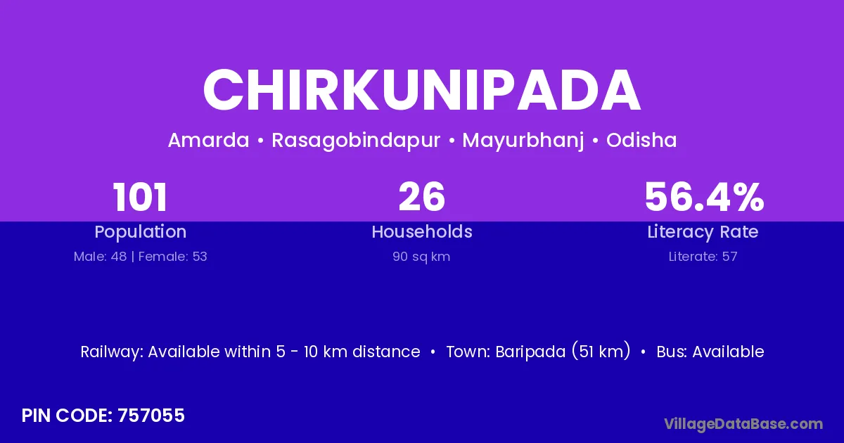 Baripada (51 km) is the nearest town to Chirkunipada village for major economic activities and is located approximately 51 km away.