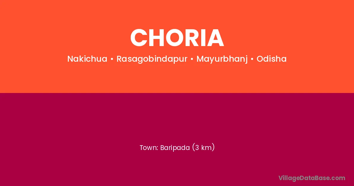 Baripada (3 km) is the nearest town to Choria village for major economic activities and is located approximately 3 km away.