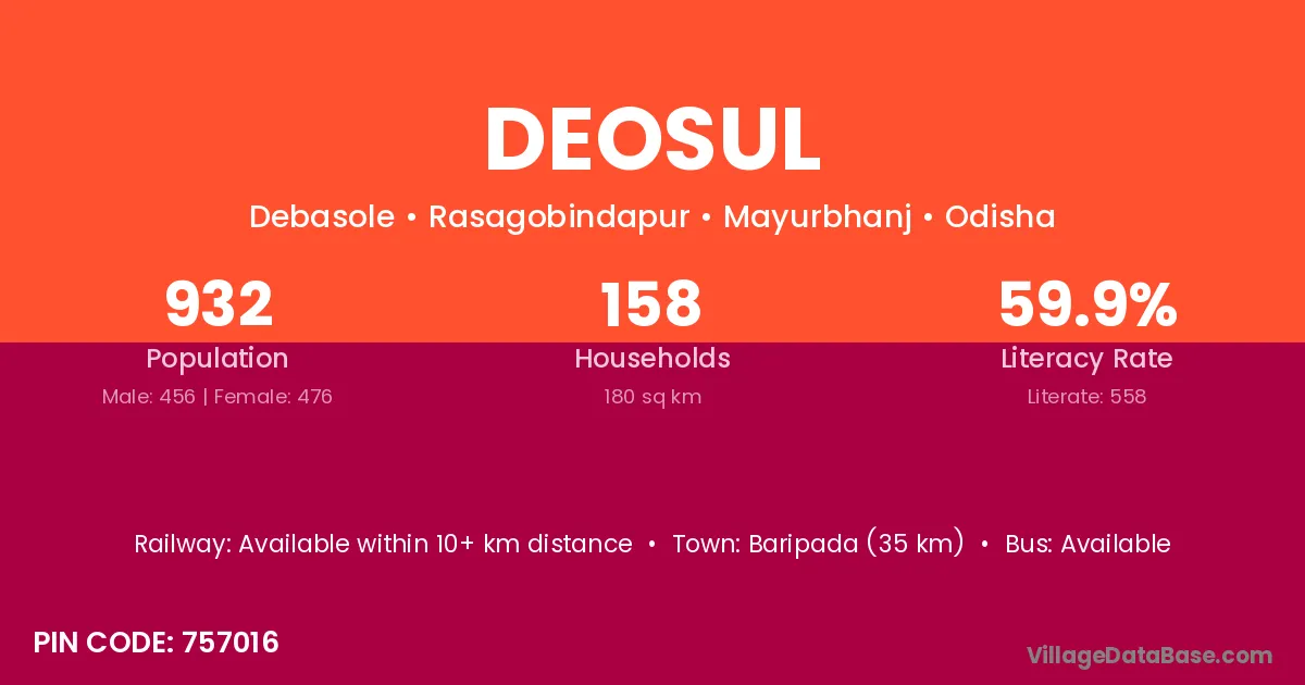 Baripada (35 km) is the nearest town to Deosul village for major economic activities and is located approximately 35 km away.