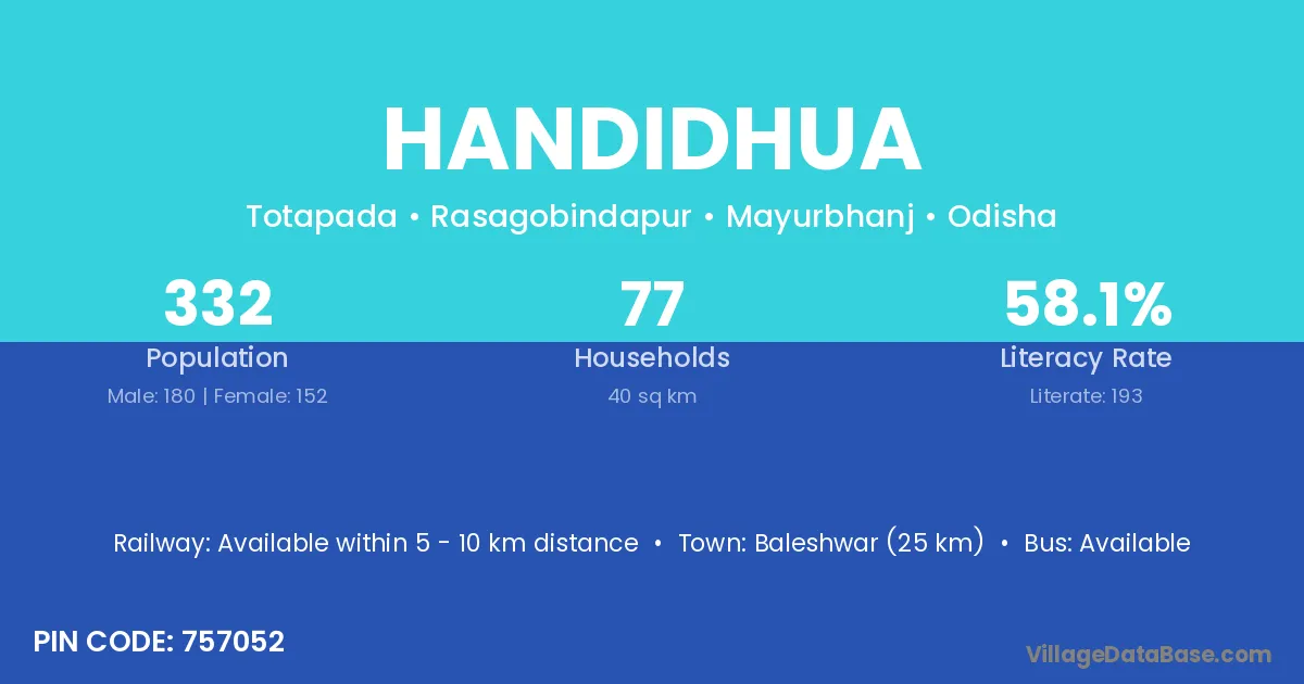 Baleshwar (25 km) is the nearest town to Handidhua village for major economic activities and is located approximately 25 km away.