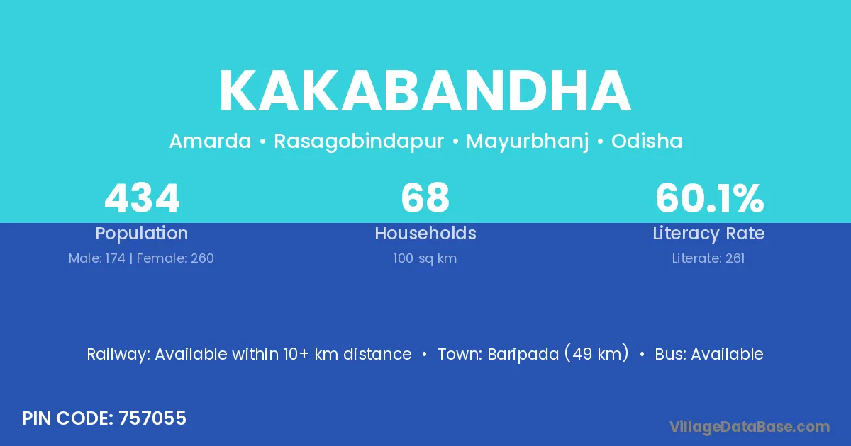 Baripada (49 km) is the nearest town to Kakabandha village for major economic activities and is located approximately 49 km away.