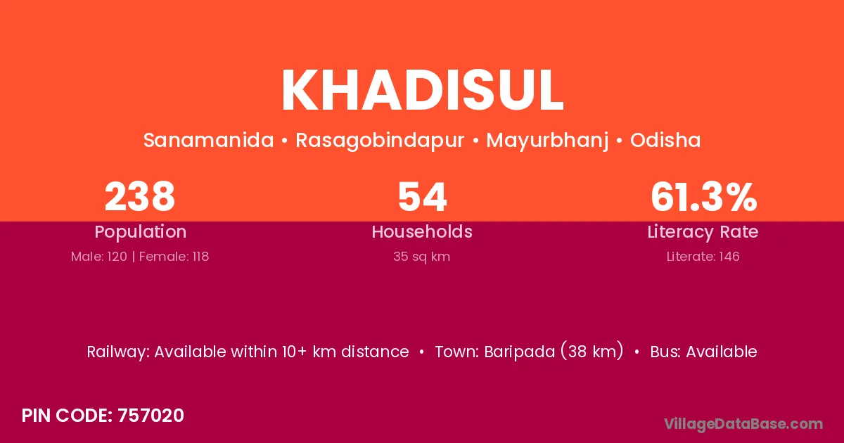 Baripada (38 km) is the nearest town to Khadisul village for major economic activities and is located approximately 38 km away.