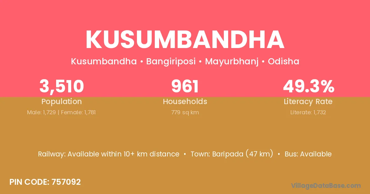 Baripada (12 km) is the nearest town to Kusumbandha village for major economic activities and is located approximately 12 km away.