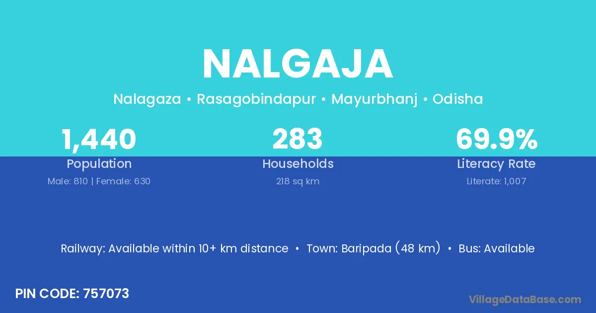Baripada (48 km) is the nearest town to Nalgaja village for major economic activities and is located approximately 48 km away.