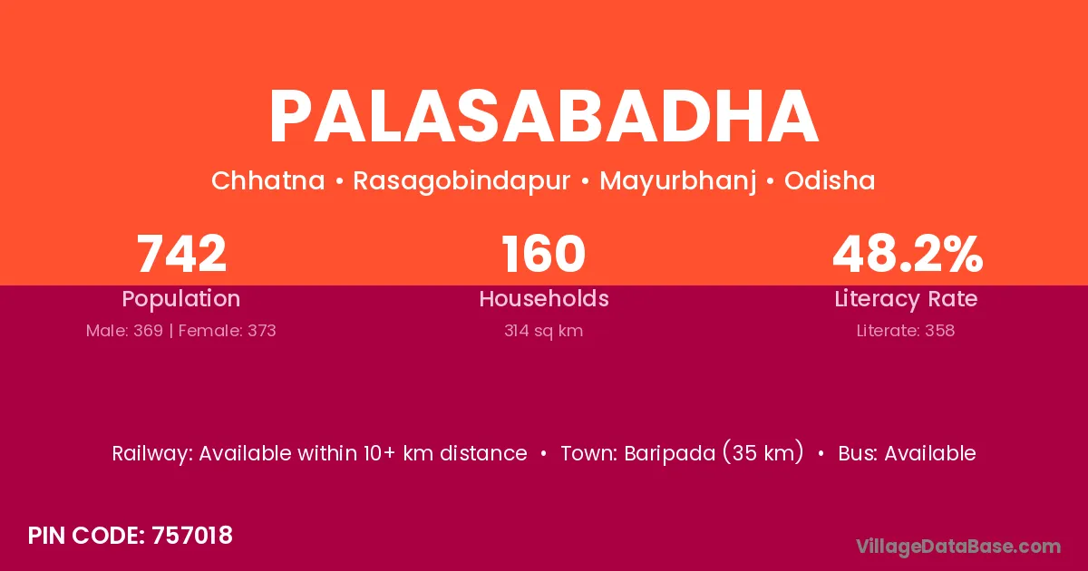 Baripada (35 km) is the nearest town to Palasabadha village for major economic activities and is located approximately 35 km away.