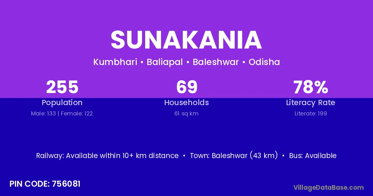 Baripada (48 km) is the nearest town to Sunakania village for major economic activities and is located approximately 48 km away.