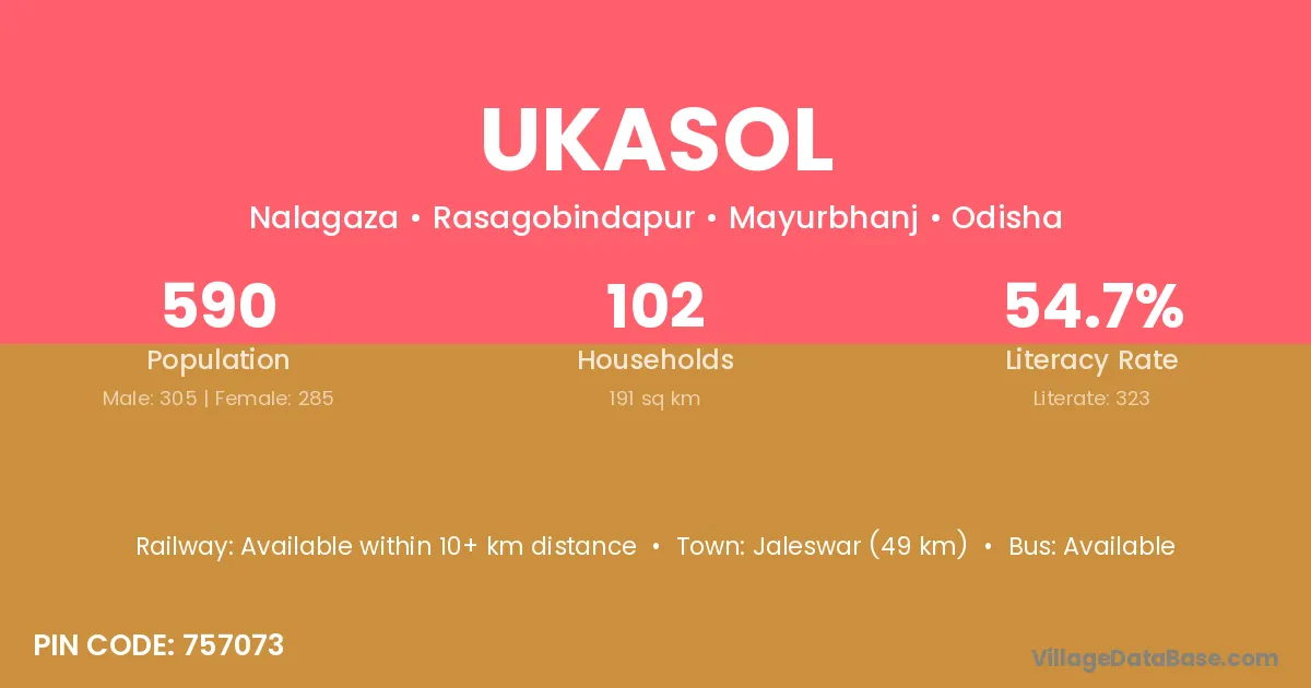 Jaleswar (49 km) is the nearest town to Ukasol village for major economic activities and is located approximately 49 km away.