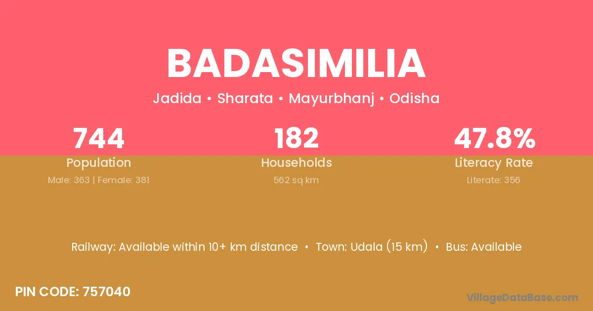 Badasimilia village has a total population of 744 people, of which 363 are males and 381 are females.