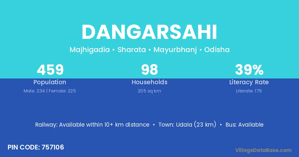Udala (23 km) is the nearest town to Dangarsahi village for major economic activities and is located approximately 23 km away.