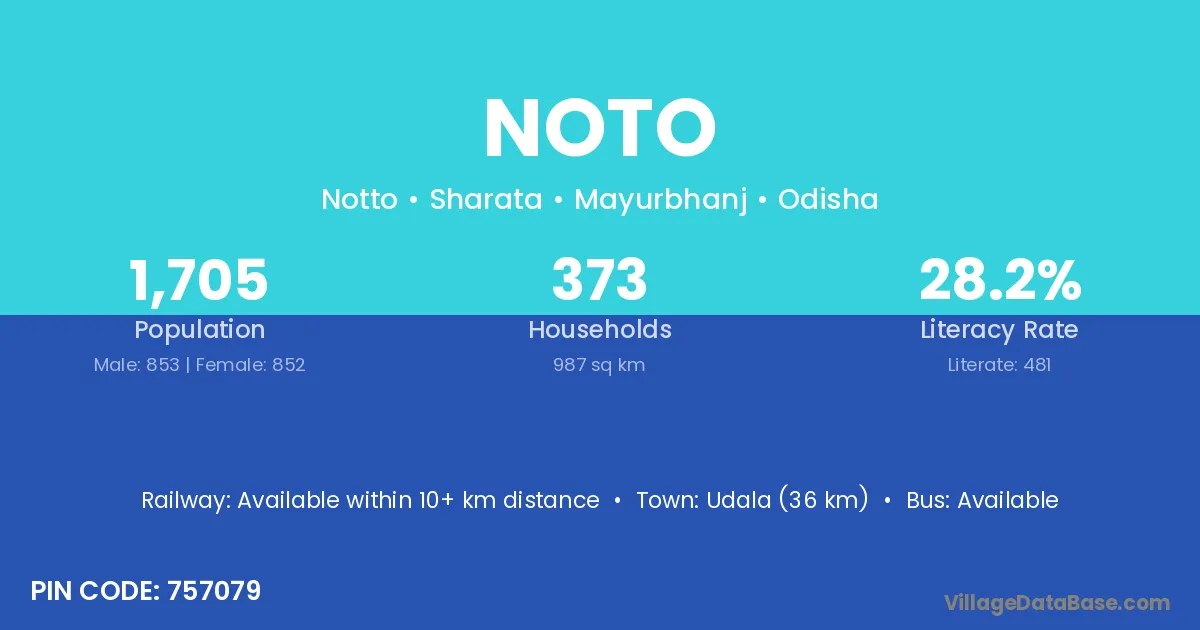Udala (36 km) is the nearest town to Noto village for major economic activities and is located approximately 36 km away.