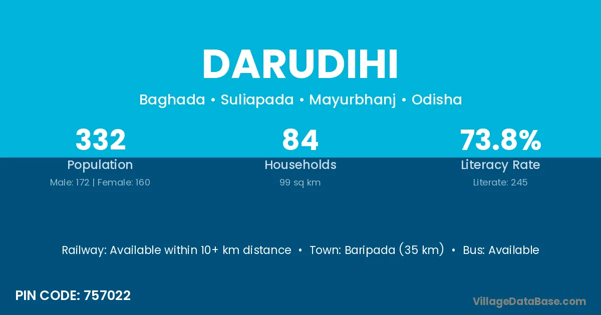 Baripada (35 km) is the nearest town to Darudihi village for major economic activities and is located approximately 35 km away.