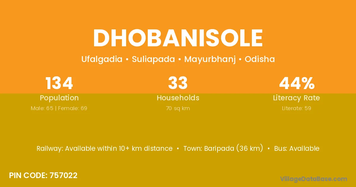 Baripada (36 km) is the nearest town to Dhobanisole village for major economic activities and is located approximately 36 km away.