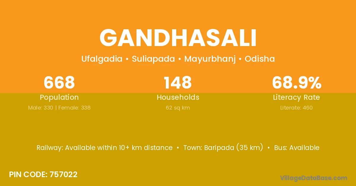 Gandhasali village has a total population of 668 people, of which 330 are males and 338 are females.
