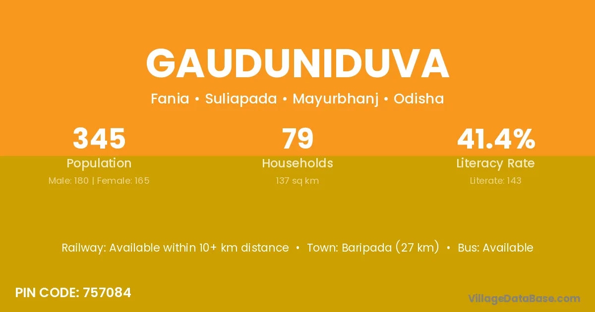 Baripada (27 km) is the nearest town to Gauduniduva village for major economic activities and is located approximately 27 km away.