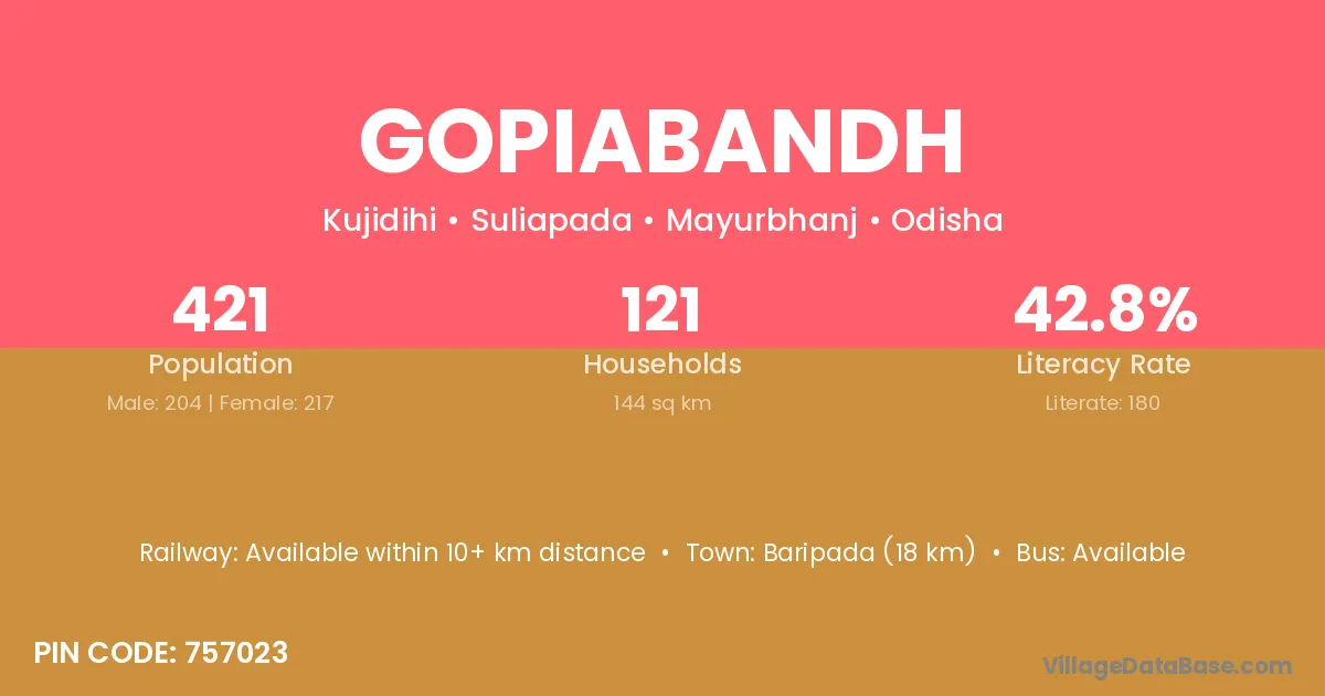 Gopiabandh village has a total population of 421 people, of which 204 are males and 217 are females.