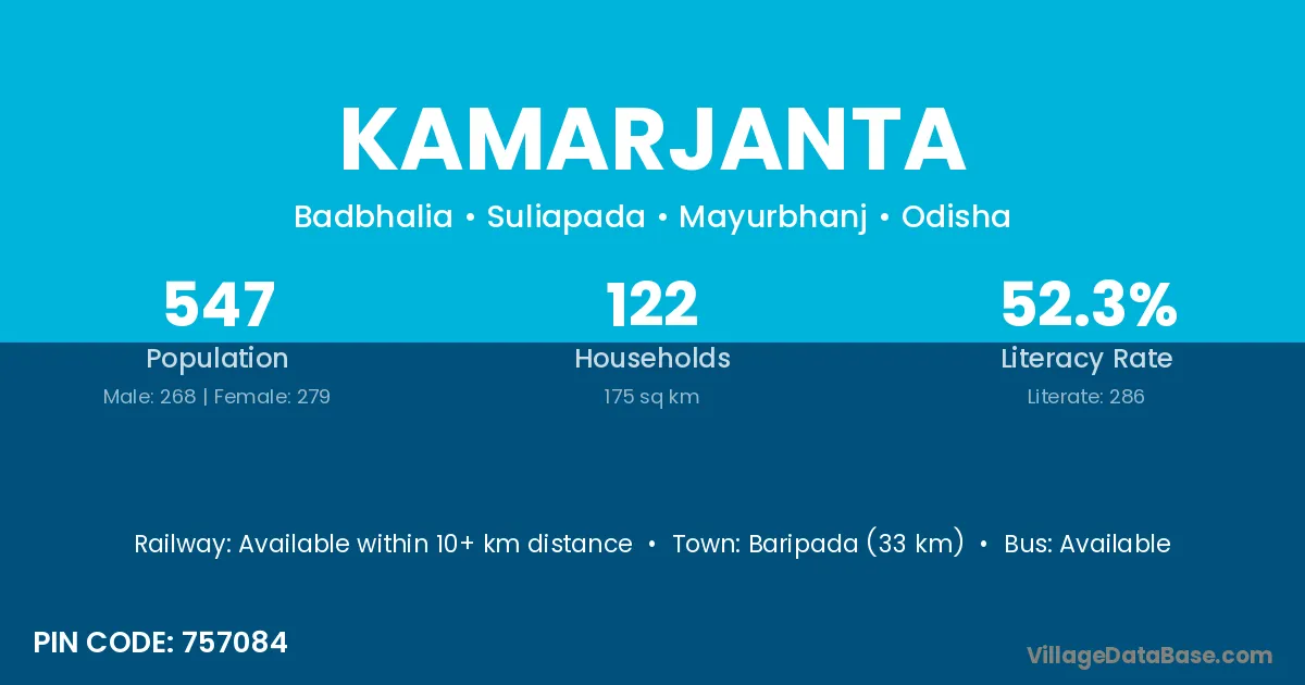 Baripada (33 km) is the nearest town to Kamarjanta village for major economic activities and is located approximately 33 km away.
