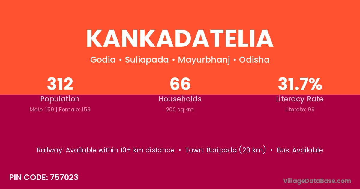 Baripada (20 km) is the nearest town to Kankadatelia village for major economic activities and is located approximately 20 km away.