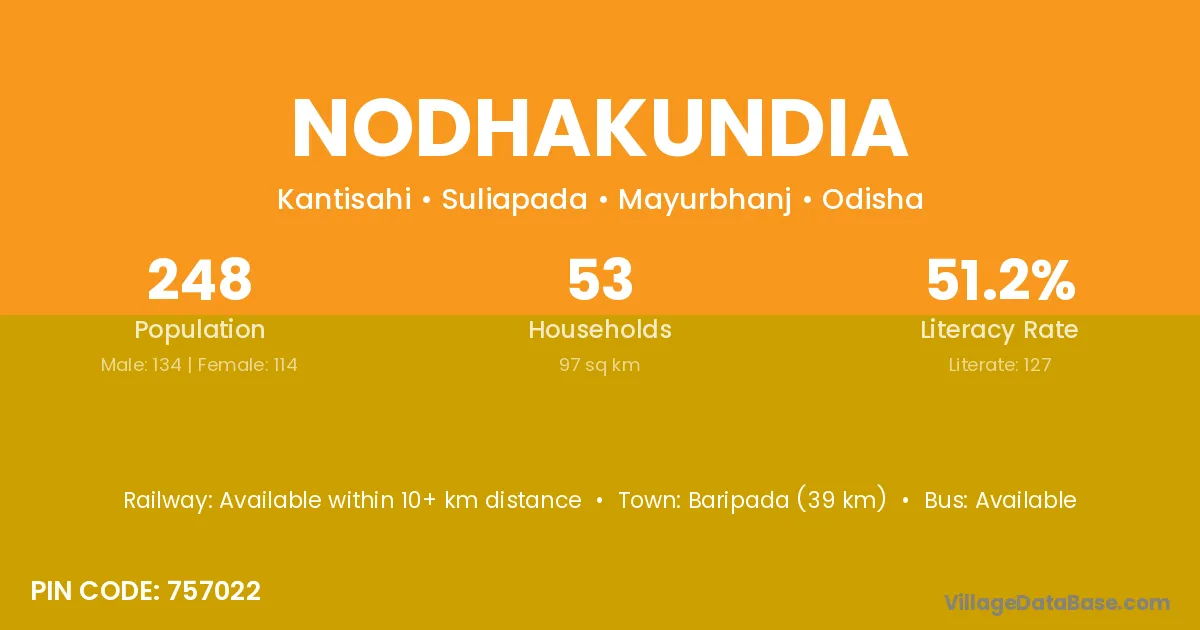 Baripada (39 km) is the nearest town to Nodhakundia village for major economic activities and is located approximately 39 km away.