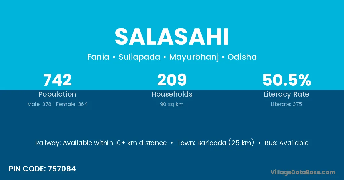 Baripada (25 km) is the nearest town to Salasahi village for major economic activities and is located approximately 25 km away.