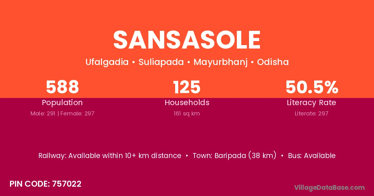 Sansasole village has a total population of 588 people, of which 291 are males and 297 are females.