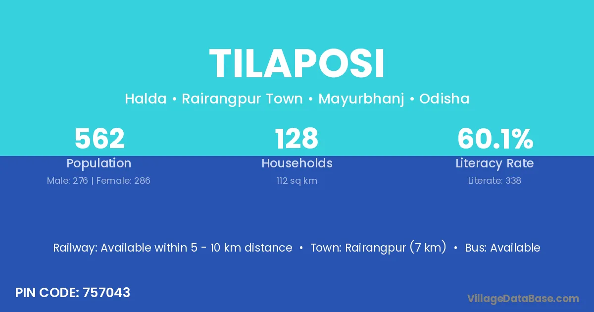 Baripada (20 km) is the nearest town to Tilaposi village for major economic activities and is located approximately 20 km away.